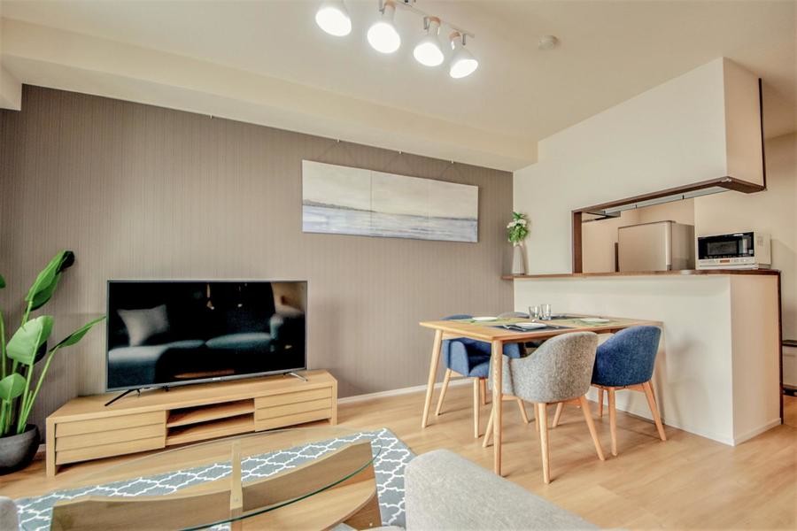 2LDK(52.5平方メートル)のリビングは、11.5畳あります。ガラスやファブリックなど異素材を取り入れたナチュラルテイストのインテリアで統一。また、各部屋にベッドと収納を完備しており、ファミリーでの長期滞在にはピッタリ。キッチン・独立洗面台・浴室も広々しているため、東京でのストレスフリーな生活が実現します。