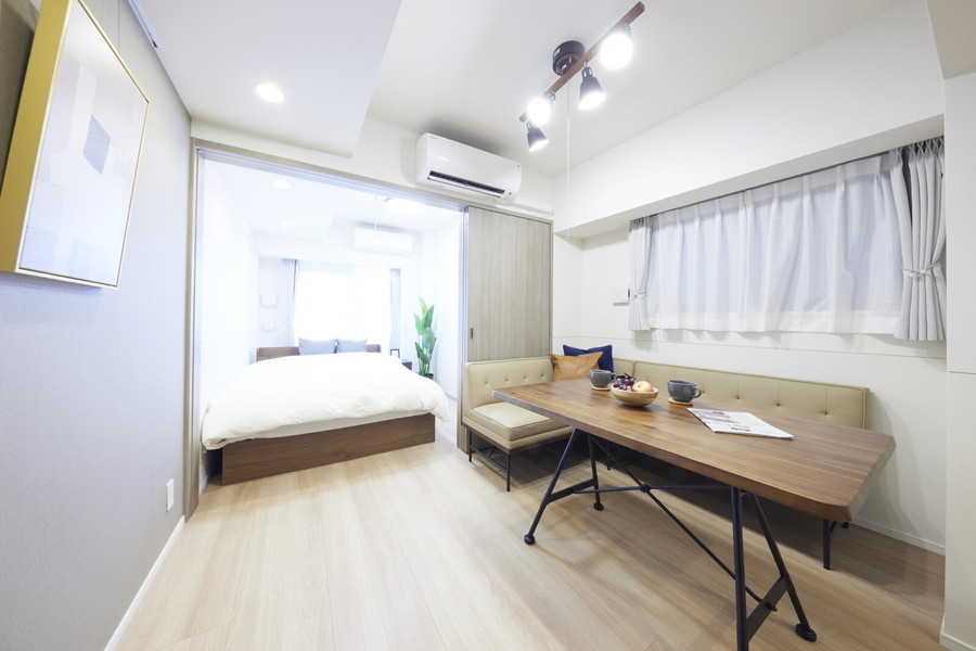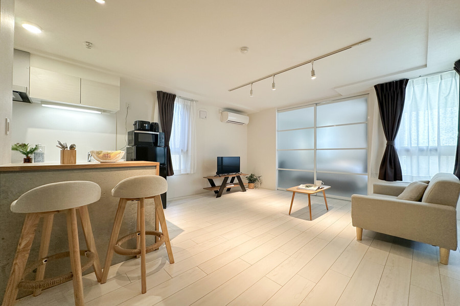 ホワイトカラーで統一された2LDK(48.1平方メートル)の室内には、ナチュラルな色味のインテリアが映える仕様に。対面式のキッチンは広々としており、料理好きな方にはピッタリ。各部屋にベッドも配置しているため、ファミリー利用やペットと一緒に過ごしたい方にも魅力的です。