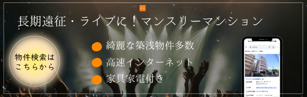 長期で遠征する人や、連続して複数の公演に参戦する人にとってホテル暮らしだと滞在費がかさむもの。そのような場合は、マンスリーマンションの選択肢も検討してみましょう。一見費用は高く感じますが、ホテルと比べてトータルコストは節約できます。