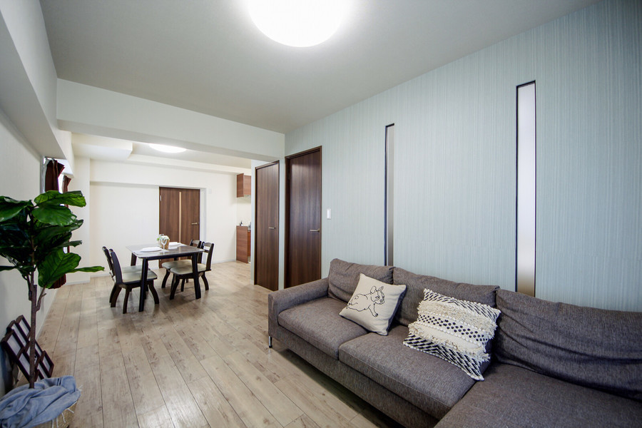 築年数は古いものの、2LDKの室内はブラウン系のインテリアで統一され、水回りも全て一新。15畳以上あるリビングには3人掛けのソファがあり、ゆったり過ごせます。リビング横の洋室にはデスク&チェアもあるため、在宅ワークや子ども部屋としても活用できます。