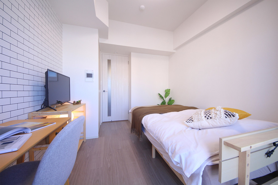 室内は1Kタイプ(25.8平方メートル)であり、余裕をもって一人暮らしできる広さです。ホワイトを基調としたシンプルな内装に、シックなテイストの家具を配置。