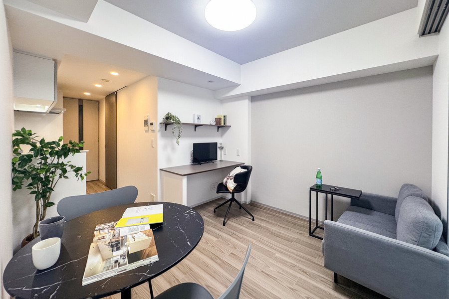 1LDKタイプ(29.8平方メートル)の室内は、ダイニングとソファを置いても広々とした空間。洋室にはセミダブルのベッドと大容量の収納があるため、ゆったり過ごせます。キッチンは2コンロ仕様に加えて、上下に収納もあり。長期滞在ならパントリー代わりとしても活用できます。