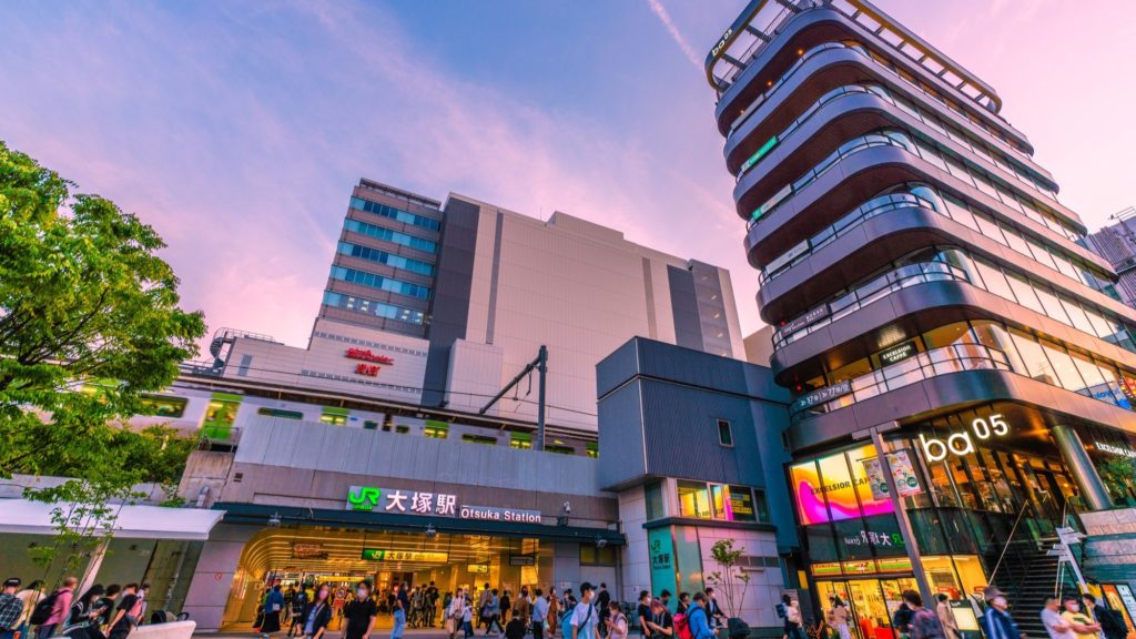 大塚駅北口には現代的なビルが目立つ一方で、