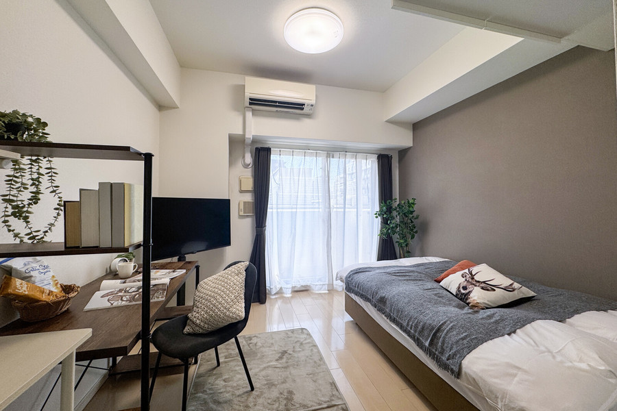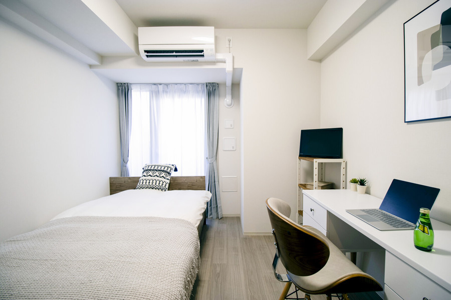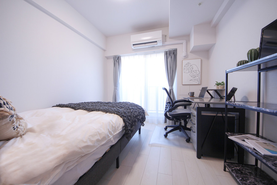 1Kタイプ(21.1平方メートル)の室内には、セミダブルベッドを設置。デスク(引き出し付)&チェアはテレワークに適した仕様であり、在宅ワークが中心の方にもおすすめの物件です。
