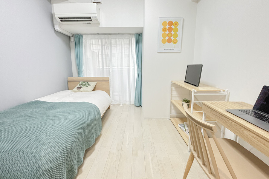 1Rタイプ(22.5平方メートル)のインテリアは、北欧テイストに統一。ティファニーブルーのカーテンとベッドカバーにより、開放的な雰囲気に仕上がっています。もちろん、デスク&チェアも完備。水回りはセパレートなので、不便を感じず生活できます。