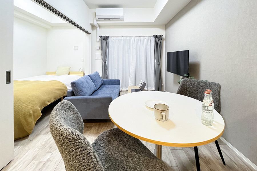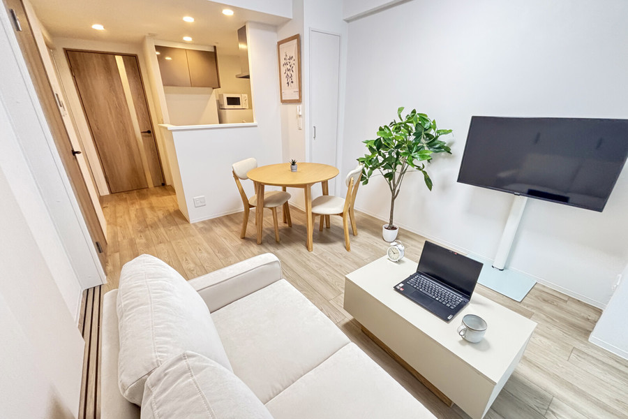 1LDK(30.4平方メートル)のリビングには、ゆったり座れるソファとダイニングテーブルを配置。隣接の寝室にはセミダブルのベッドがあり、しっかり体を休められます。コンパクトではありますが、2025年3月築の物件なので、設備の充実度は申し分ありません。