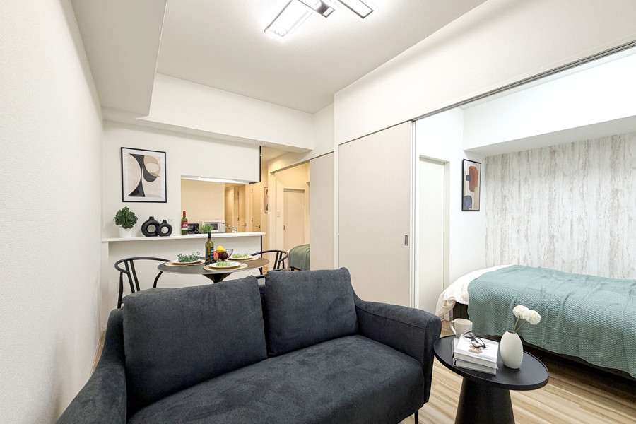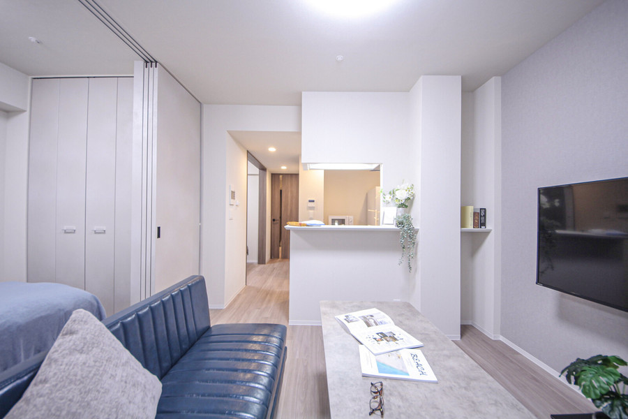 室内は、一人暮らしには十分な広さの1LDKタイプ(34.4平方メートル)。リビングには足を伸ばせる広めなソファやカフェテーブルに加えて、小ぶりなデスク&チェアも設置しています。キッチンは視界が広がるカウンターキッチンを採用しており、料理好きな方にはおすすめの物件です。